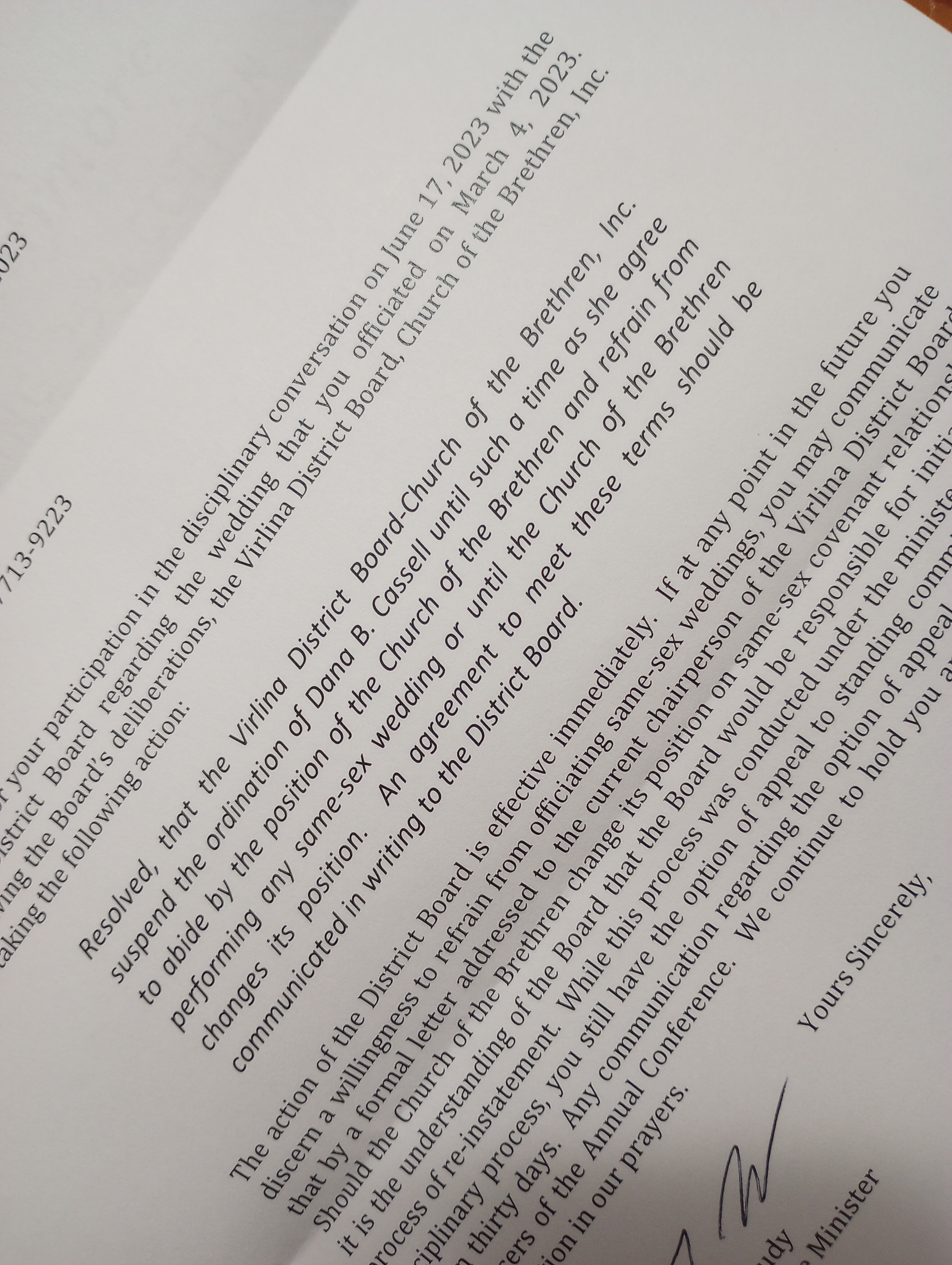 A District Board voted – by a 2/3 majority – to terminate my ordination unless or until I agree not to officiate another same-gender wedding or the Church of the Brethren changes its position on them.