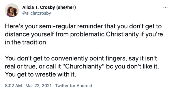 I use “we” language when I talk about the church, both its gross parts and its beautiful ones, because I am part of the church. I am complicit. I am part of the problem. I am here, and even if I quit all my jobs and denounced all my faith, white American Christianity would still be part of who I am and I would still be part of it. It annoys me when siblings in faith point fingers at one another and say “those” awful Christians! “They” are so wrong. Thank you, God, that I am not like “THEM.”