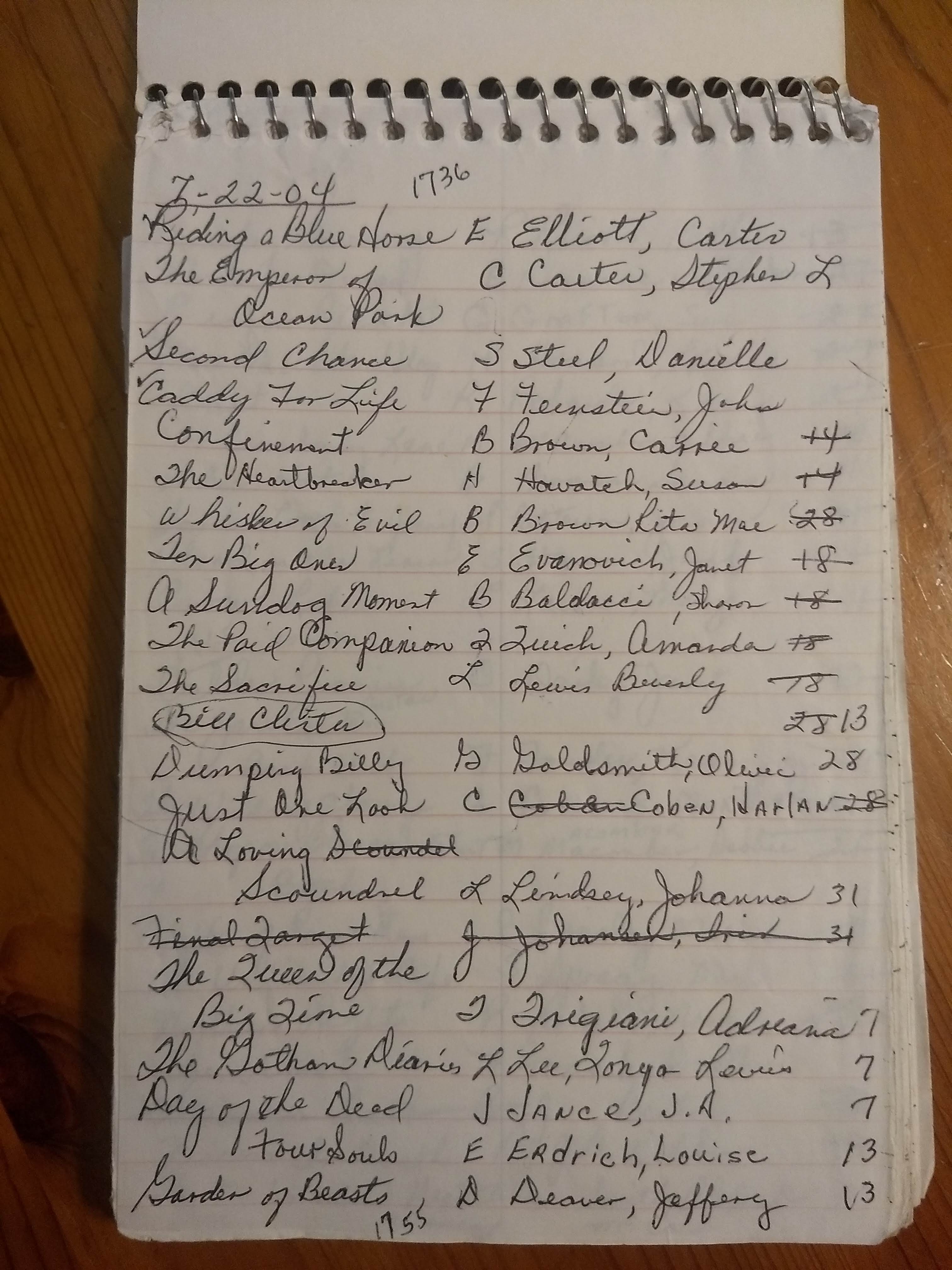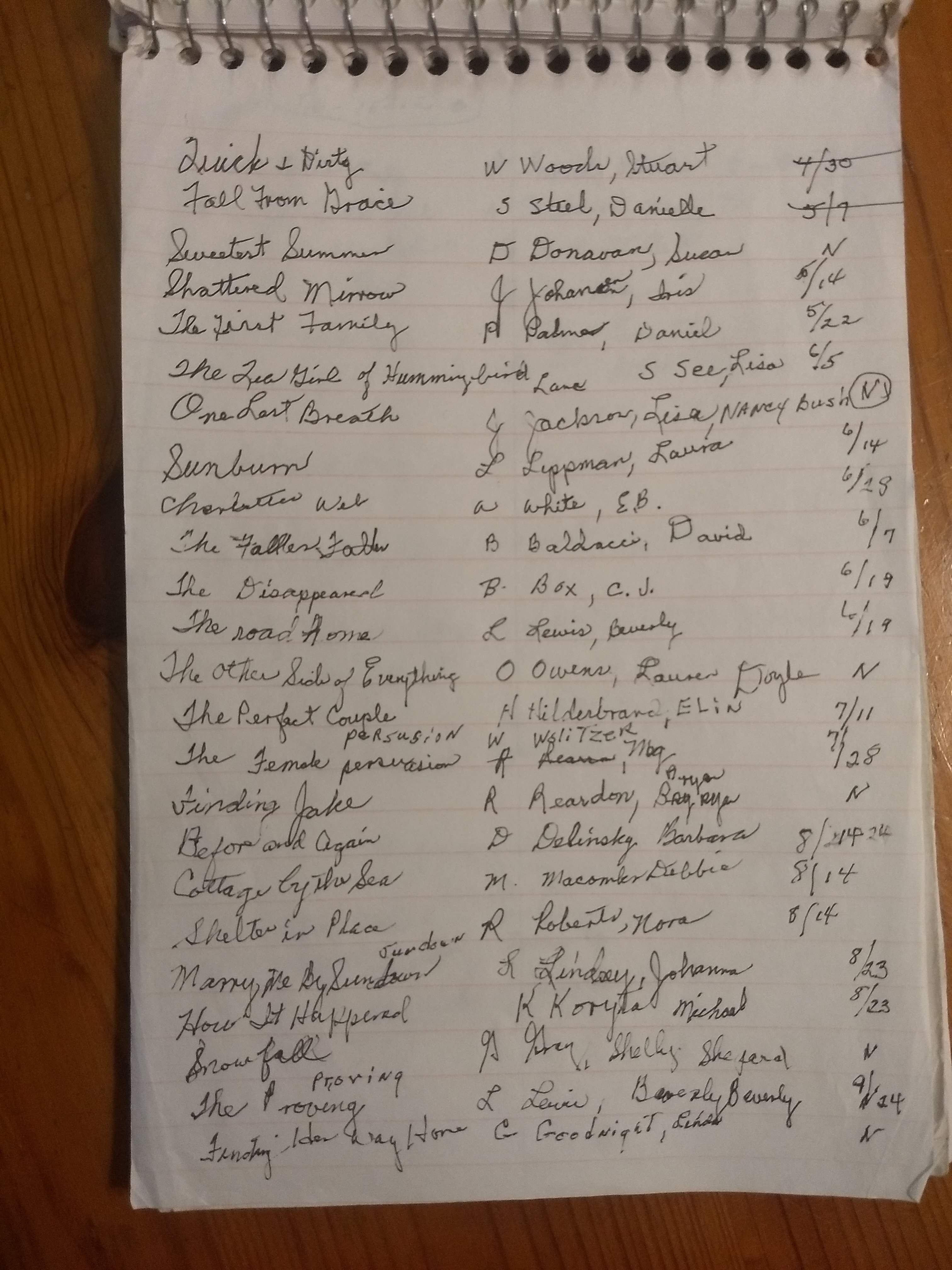 When we cleaned out my grandmother JoJo’s apartment this fall after she died, I found a treasure: her handwritten reading log, which picks up in 2004. We think she had been keeping track since my grandpa Bobby retired in 1987, and this log begins at #1736.