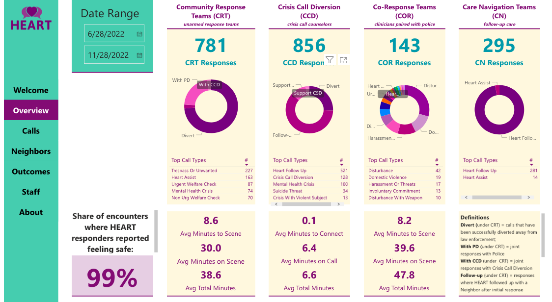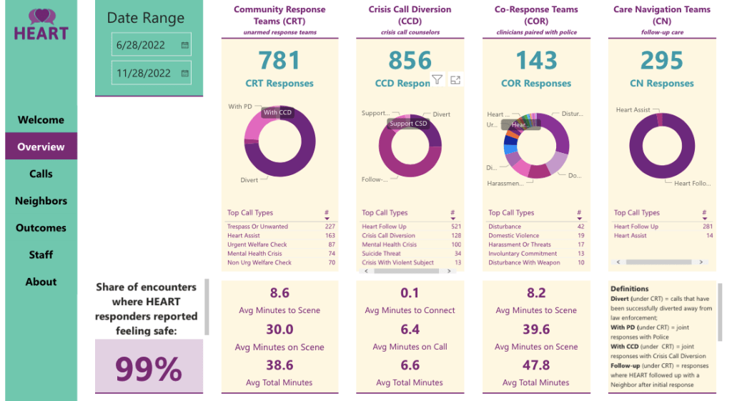 The HEART responders weren’t up and running when my neighbor called the police for the domestic disturbance in our building. Even now, a domestic violence call would be one that triggered a “Co-Response Team” visit – maybe a trained mental health professional would have arrived alongside those two young, white, armed policemen. But I read that during one of the HEART team conversations, the neighbor in need of assistance saw their white van and teal shirts arrive on the scene and said, “Oh, I was hoping it would be you guys who showed up!” The pilot program was only operating in a certain geographic area, and confined to weekday business hours. But already, the results have been so promising that the city has added a second team of HEART responders and expanded to 24/7 coverage.